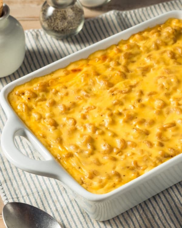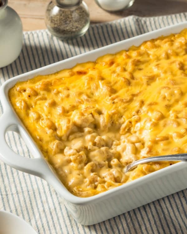 - Drain the pasta well, but keep it mind that you do not rinse. Then pour the macaroni into a greased 9×13-inch baking dish and mix in the 1/3 cup of butter, then set this aside.