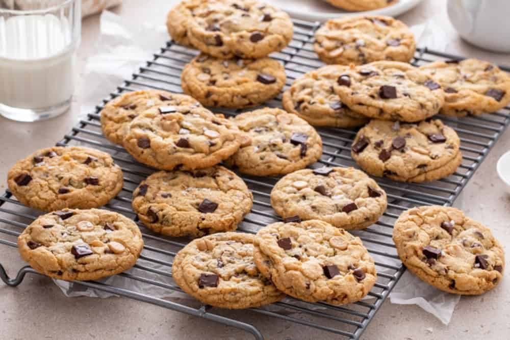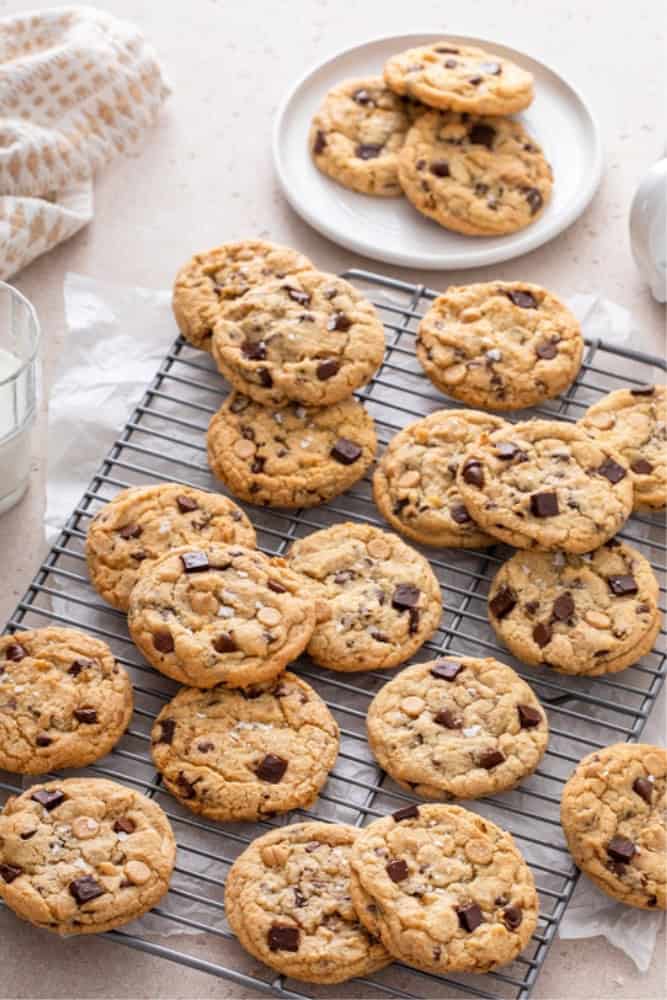 ✅ A total of 3 batches to bake all 30 choc chip cookies with just one (13″x18″) tray. It’s a little slower, but still super easy and so worth it in the end!